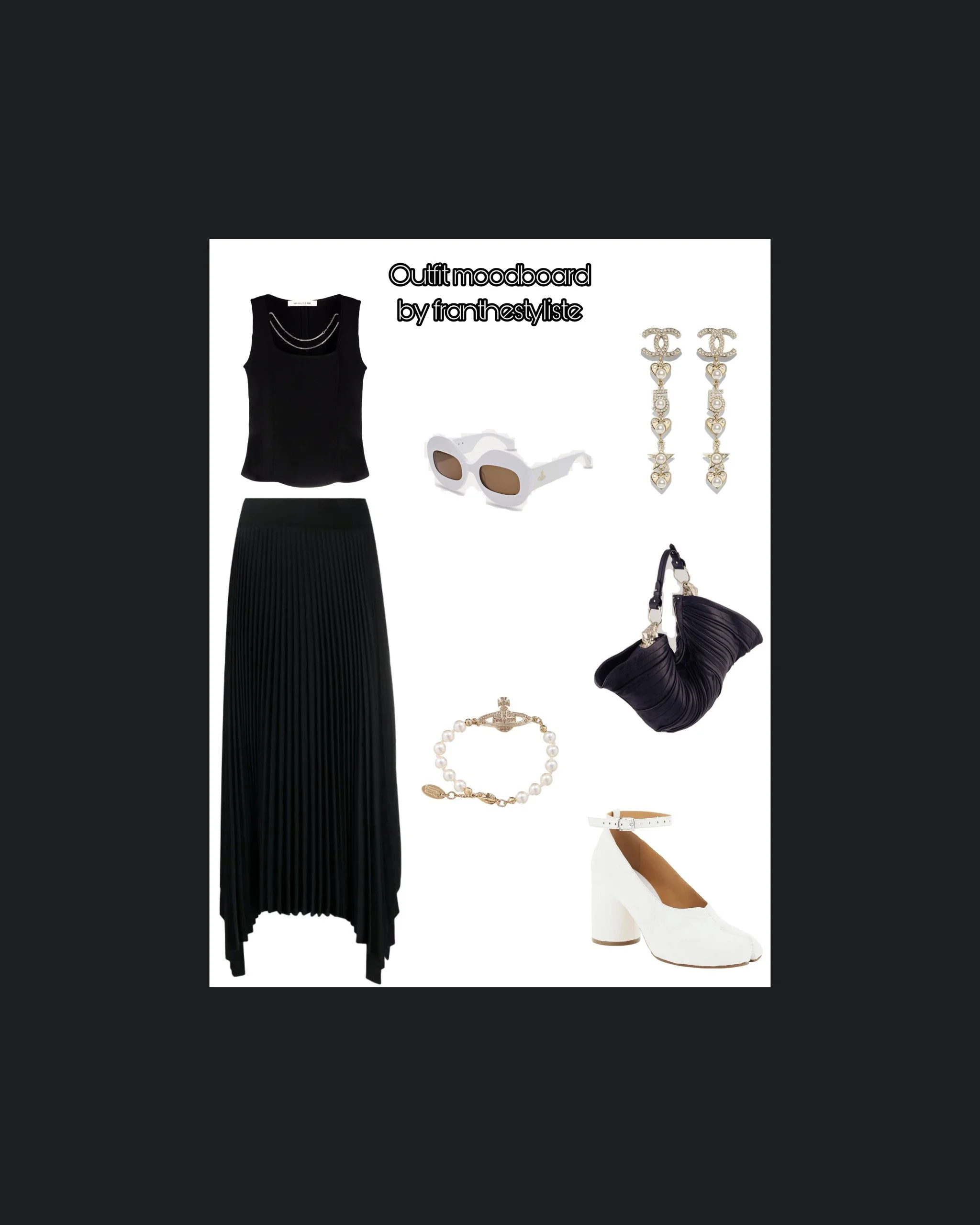 This last outfit has to be my absolute favourite. Not because of its simplicity, but because it's an “ALL BLACK” outfit, that is ALMOST. I also decided to style these “TABI MARY-JANE PUMPS” with a skirt and a top as well. AN OBSESSION I PRESUME. Pleats are such a nice touch with heeled shoes, which is why I went with this “JOSEPH” pleated midi skirt for the bottoms. For the top piece, I picked an “ALYX STUDIO” chain-detail sleeveless blouse, which -quite obviously- has a chain across the neckline that, to me, serves as as a neck accessory already. And for that reason I have also gone with just some earrings and a bracelet for the jewelry. The earrings are “CHANEL” and the bracelet is “VIVIENNE WESTWOOD” -because pearls and diamonds are never a fail.- I have always wanted to style this “ARNOLDO” elephant bag, but never found the right outfit for it. HOWEVER, I believe this outfit is the right one for it. Last but not least, the sunglasses, I always say, “AN OUTFIT IS NEVER COMPLETE WITHOUT A PIECE OF EYEWEAR.” Be it sunglasses or a prescribed eyewear with some fabulous frames; for this look I have picked a pair of sunglasses from “VIVIENNE WESTWOOD” which I just adore 🥰, I mean just look at them!