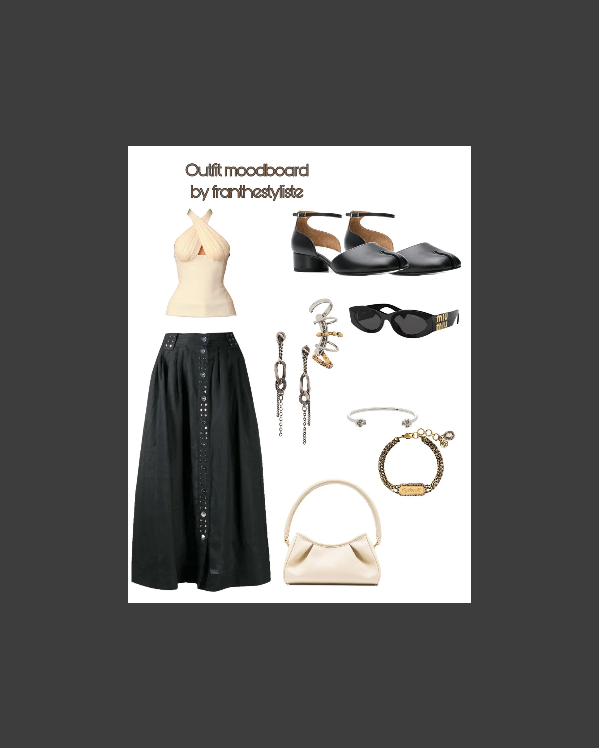 With this second outfit, once I looked at the shoes I immediately thought about this “SCULPTED HALTER TOP” from a brand called “TAE PARK”. The structured fitting of this top paired with the “TABI TOE BLOCK HEEL SANDALS” give a look that says “STYLISH YET CAREFREE.” I want the look to be worn with a skirt, that is when I wear it, so I paired it with an “A-LINE MIDI SKIRT” from the brand “GANNI.” The fluidity of the skirt is a huge contrast from the stillness of the top, which I did intentionally to for that extra carefree vibe. Now the accessories, when I style halter tops I like to “NOT STYLE THEM” with necklaces, that is most times, on occasions I definitely do. But for this look I definitely went for just really bold earrings, bracelets and a pair of sunglasses. Pairing the outfit with earrings from “WERKSTATTMUNCHEN,” ear-cuffs and bracelets from “ALEXANDER MCQUEEN” and oval-framed sunglasses from “MIU MIU” for more playfulness?😂. And the finally, the last piece to hold the entire look together, “A BAG.” Going with the “ELLEME” small dimple leather shoulder bag, because it's small enough to not take too much attention from the top, since they have matching colours. And that's it for this outfit.