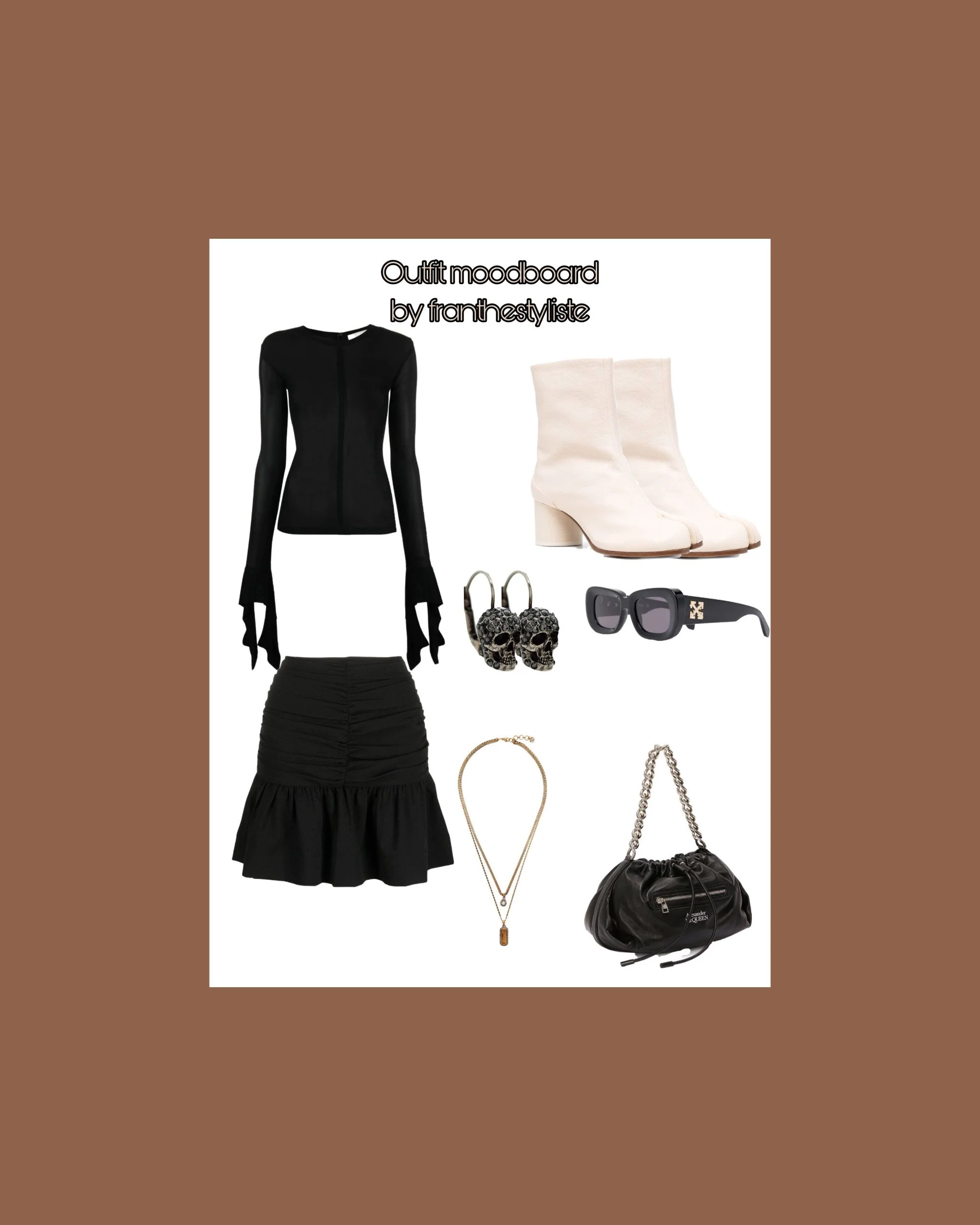 For my first outfit I really want it to feel like something CUTE & SOFT, you know very feminine; and what feels more feminine than a pair of heeled boots? -NOTHING- in case you didn't get that. So I will be building an outfit from the “TABI 55MM ANKLE BOOTS.” First the boots of course, then a top and a skirt, for the cuteness. The cutest skirt I've laid my eyes on recently has to be this “GANNI” ruched mini skirt!! So I paired it with the boots and they went so well with them. Then I picked this “AMI PARIS” semi-sheer draped-sleeves top to go with the skirt, for an added feel of edginess. NICE right? I wanted very dainty, simple jewelry for this look so I paired “ALEXANDER MCQUEEN” jewelry with the outfit. I didn't save the necklace, so I have no details for it 😔, but I definitely do for the earrings and they are called the crystal-embellished skull earrings. The bag has to be the holy grail of this outfit, it is the “ALEXANDER MCQUEEN” ball-bundle bag. It is a shoulder bag so it adds a ton of cute character to the look. To finish up the look I included a pair of “OFF-WHITE” sunglasses that have an-almost square frames. A nice touch to the vibe of the outfit.