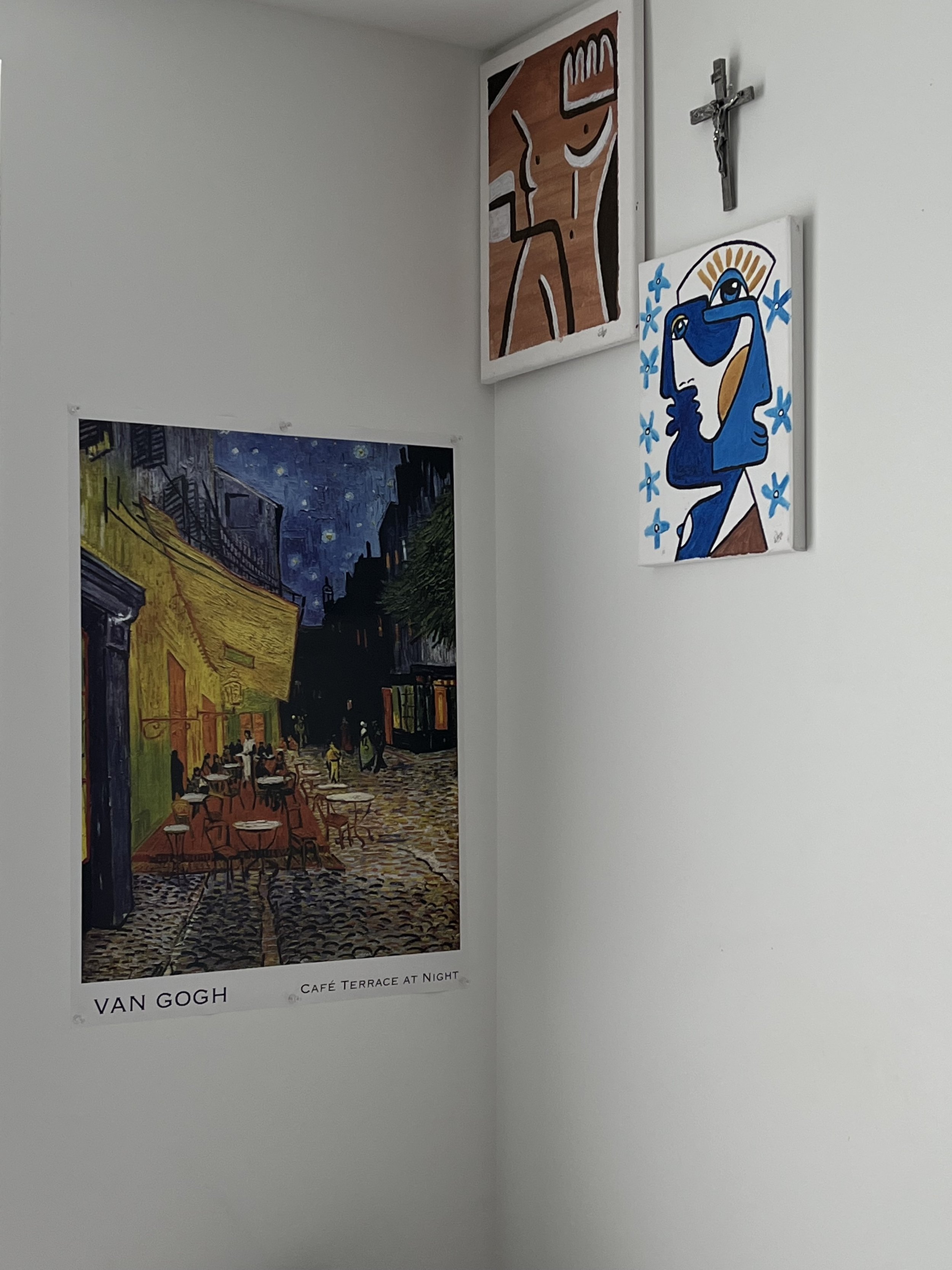 Starting with the corner beside the window, just above the bed I lie on, I have hung on display two artworks I painted over a year ago and a poster of the Van Gogh “Café Terrace At Night” painting, gifted to me by my date who took me to see the exhibition. Last but not least on that corner is my crucifix. As a devout catholic who grew up in a catholic home the habit of carrying a crucifix every you go has definitely stuck with me, and I am very thankful for that. I like to think that on this corner of my room I have the things that are very dear to me and have a very low chance of falling on me and eventually killing me in my sleep.