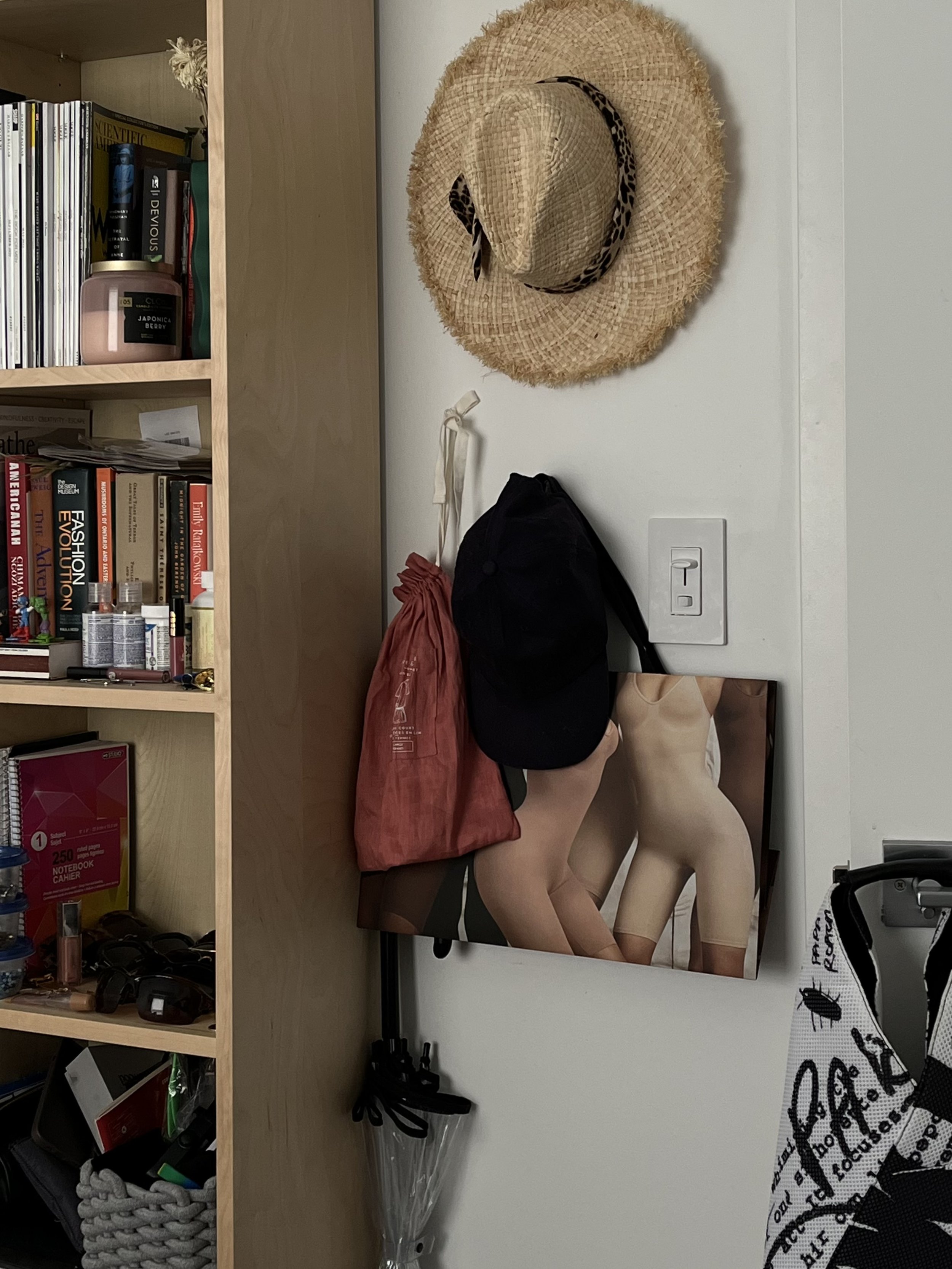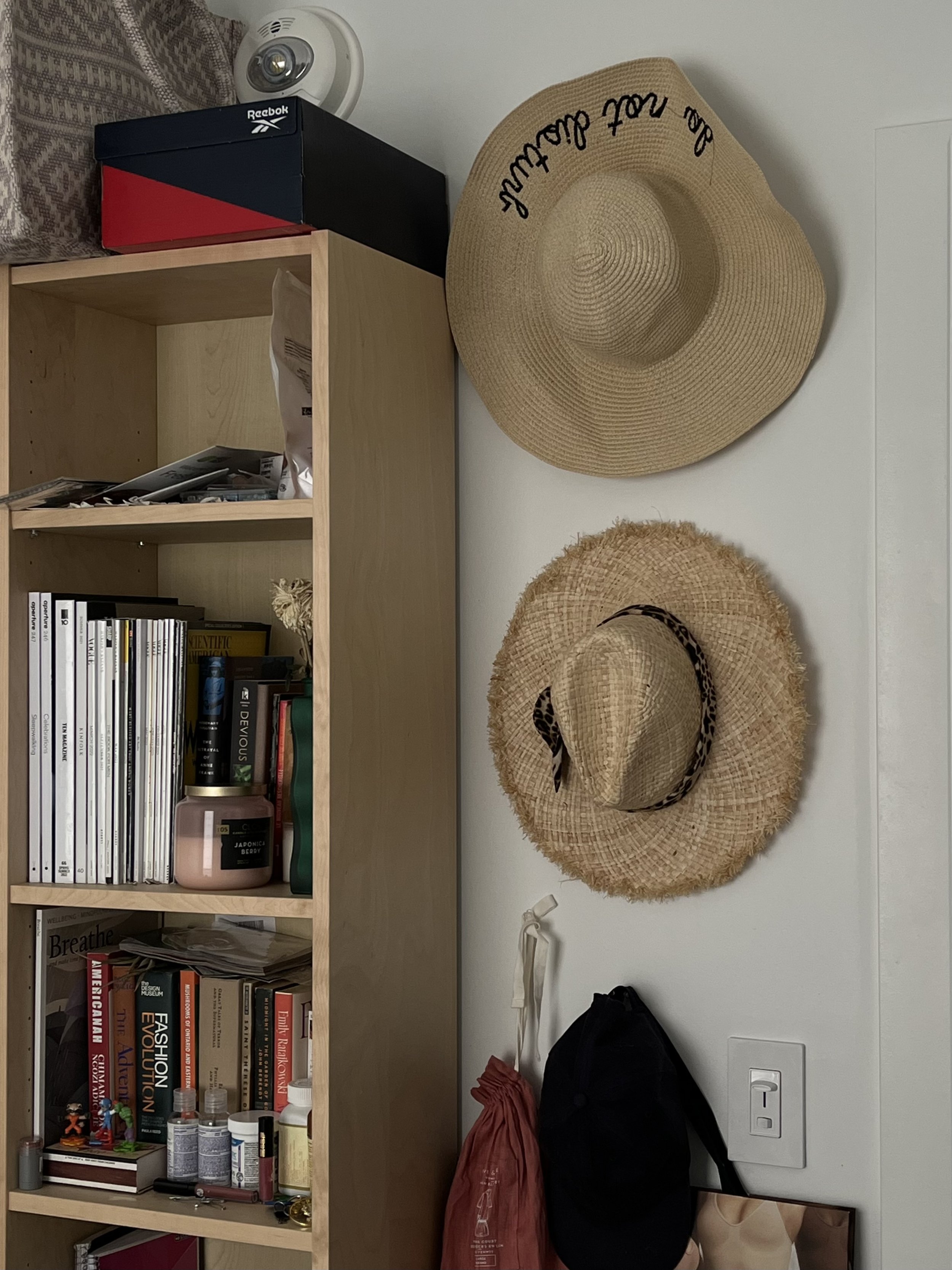 And last but not least the corner with the shelf, the beach hats, the umbrella and the other bags. The aim is to have a collection of books, which includes magazines, novels and fashion books, and a collection of unique sunglasses before the age of 25. So far so good 😌.