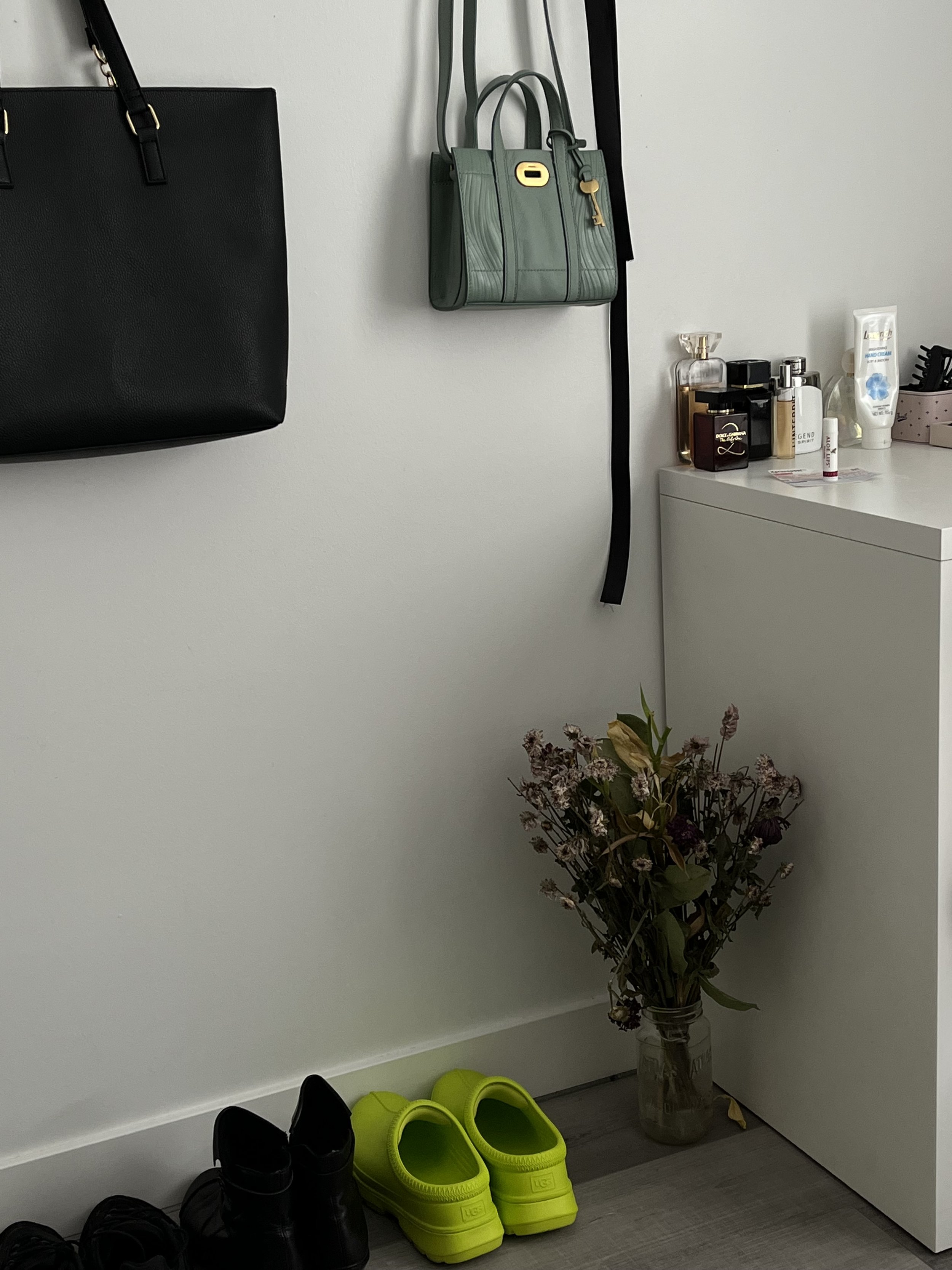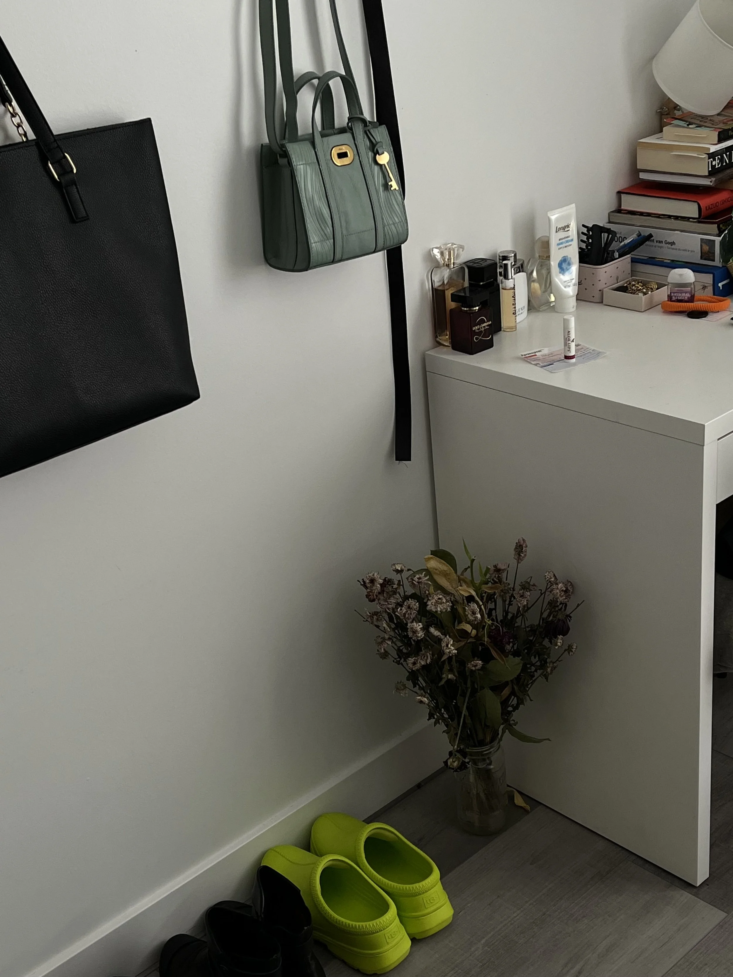 The corner with the second bunch of dead flowers, the shoes and the bags on the wall. So pleasing to the eyes 😍. Sometimes I just stop and stare at this corner for a good 5 minutes, and then it's over cause my ADHD “COULD NEVER!”