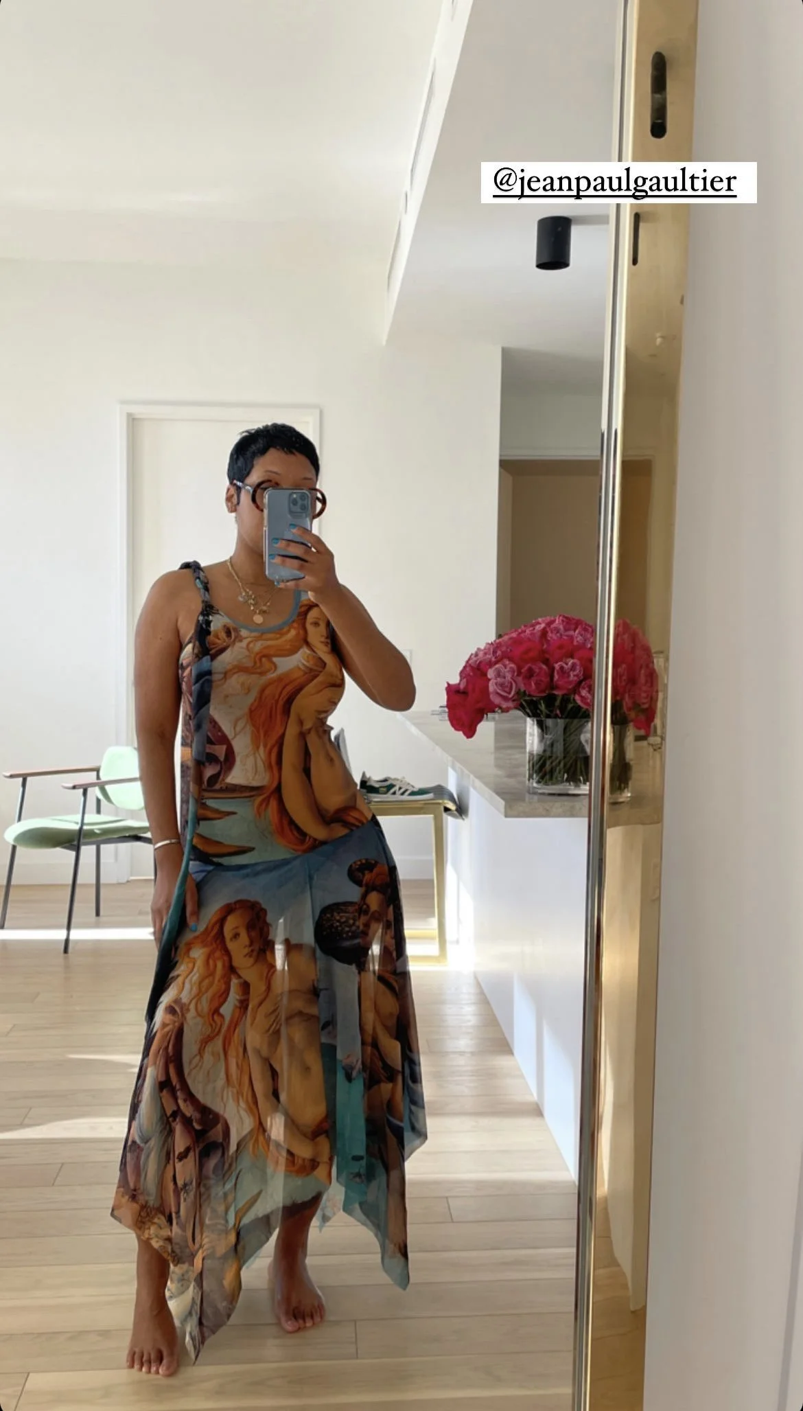 I had an asymmetrical hem dress like this, different print though, when I was either 7 or 8 years old. It was black, almost spaghetti-strapped, fitted and just so cute. It was just the right length so my mum let me wear it everywhere and anywhere, especially to CHURCH - ahh that was the best. Well, get ready ladies, and anyone who loved this style, it’s making its back into our wardrobes and I am so here for it. Here is Amanda Murray in the Jean Paul Gaultier asymmetrical tulle tank dress. Made with The Birth of Venus print, by Botticelli in 1485.